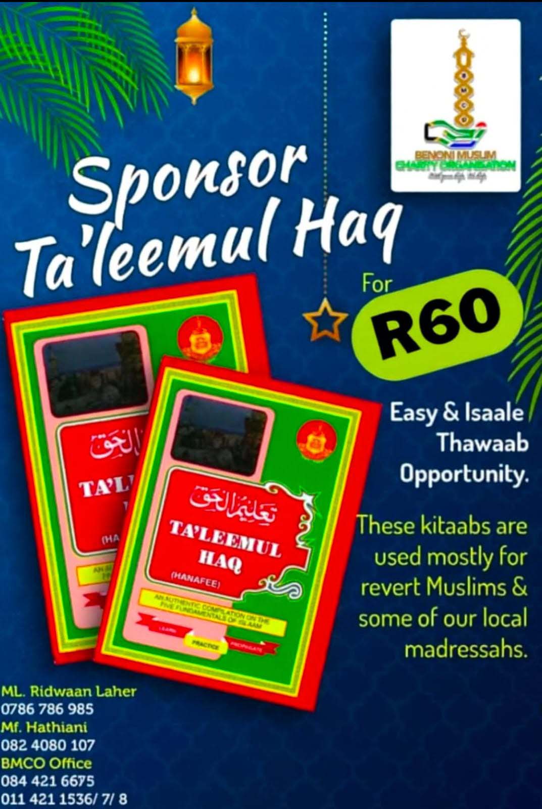 Help provide Ta’leemul Haq kitaabs for revert Muslims and local madressahs. A simple R60 donation sponsors one kitaab and earns you continuous reward (Isaale Thawaab).